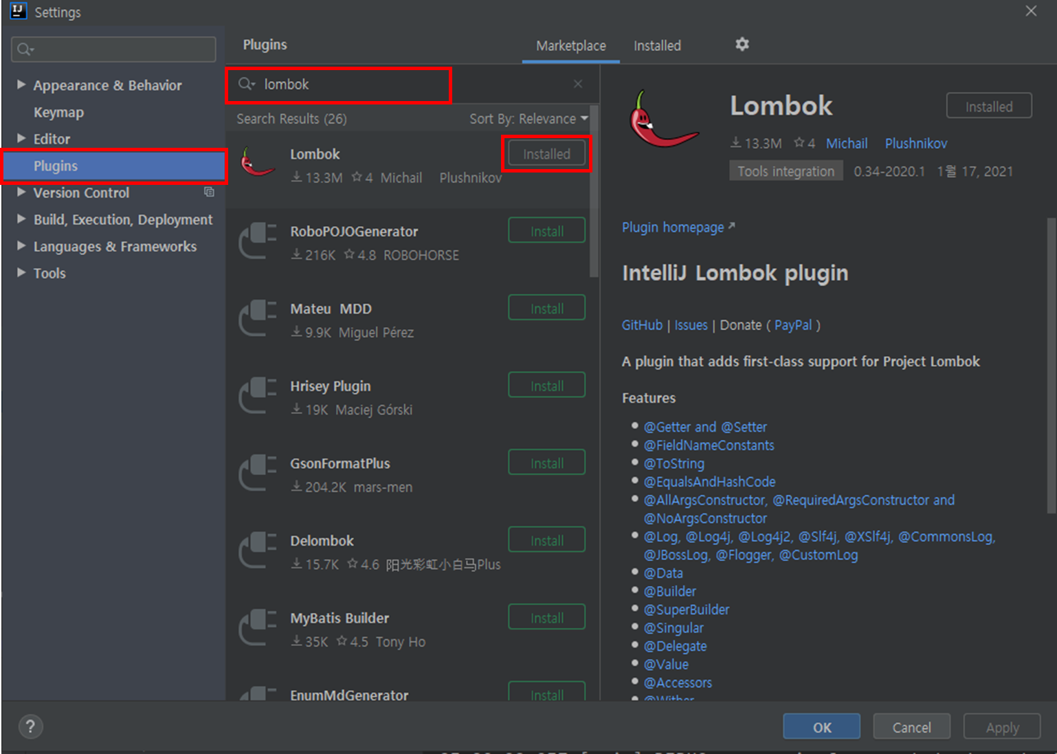프로젝트에서 setting > plugins에서 롬복을 다시 다운로드!