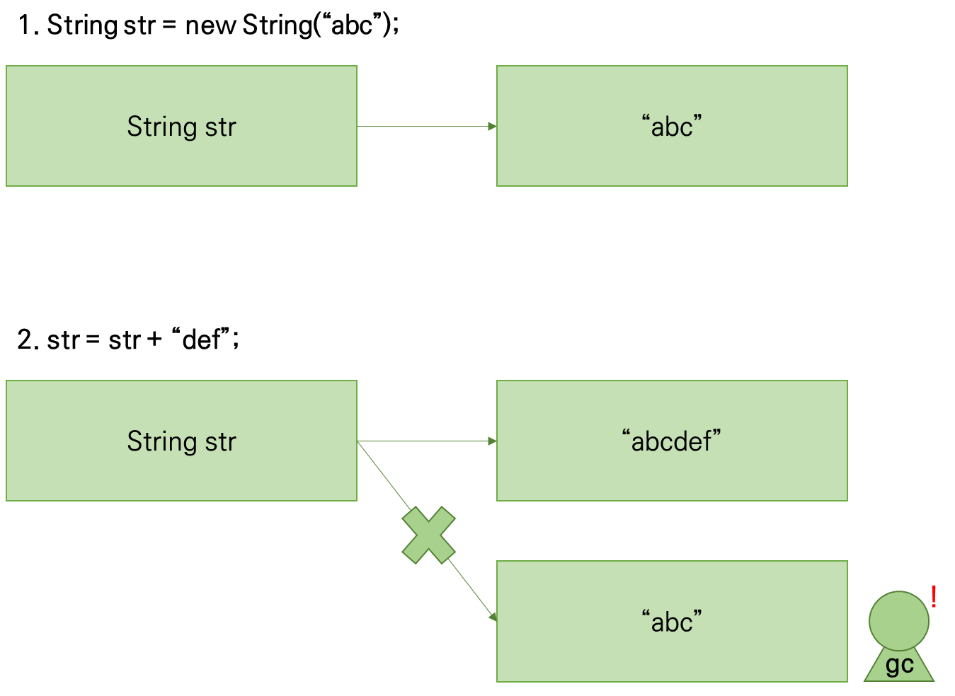 String은 위에서 말한것처럼 변하지 않는다. 이말은 문자열 연산을 하면 원래 있던 값에 이어 붙이는것이 아닌 원래값과 이어 붙이는 값을 다른 주소값에 저장하고 그 주소값을 다시 가지게 된다.