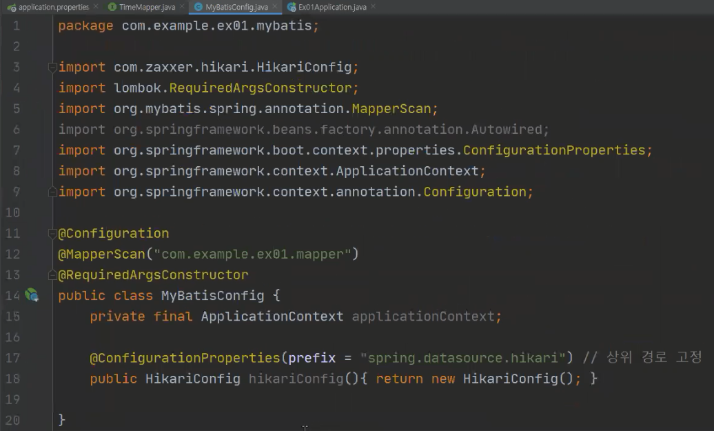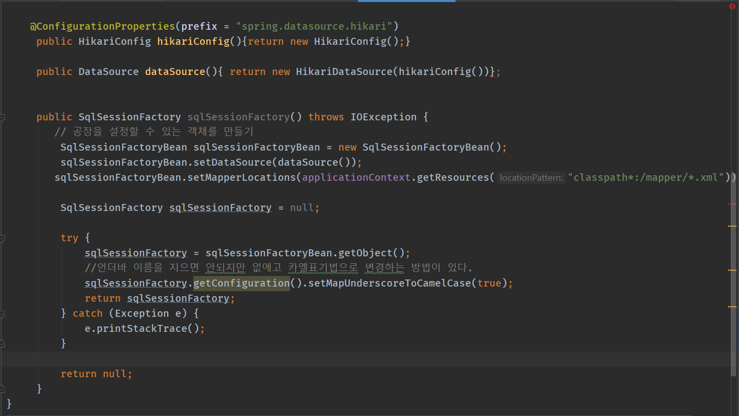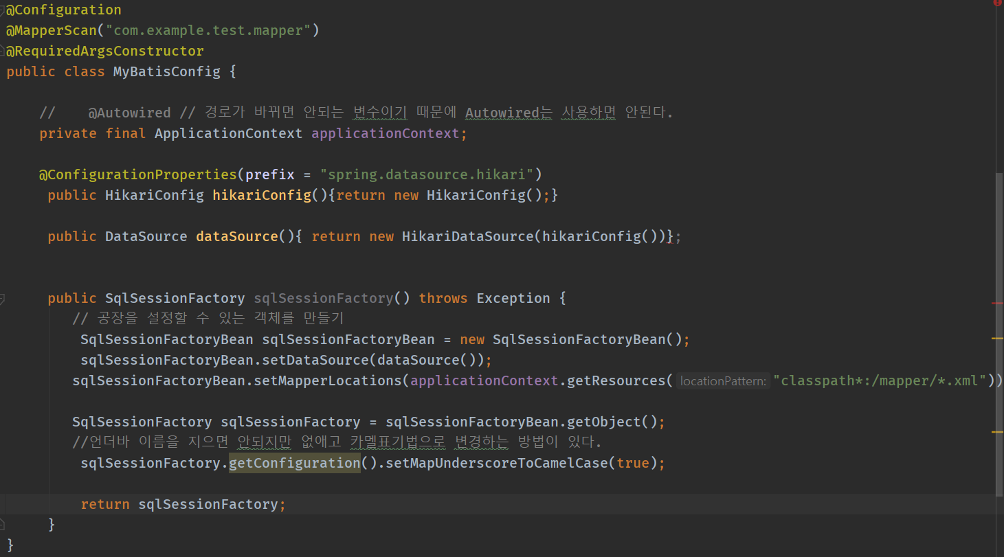 HikariConfig는 application properties에 있는 설정을 가져오기 위해서 만든것!, 그 설정을 dataSource의 필드에 맵핑에서 넣고(설정한 정보들이 들어감) , 이설정이 SqlSessionFactory로 가야하는데 직접 설정을 할 수 없으니 SqlSessionFactoryBean을 선언하여 설정하고 xml의 경로를 받아서 넣어주면 된다.