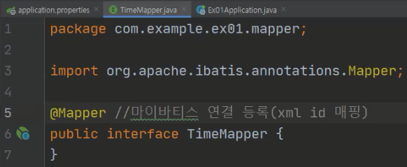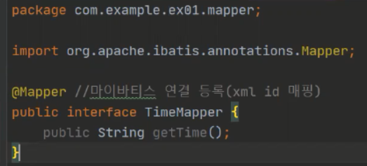 +) com.example.ex01.mapper.TimeMapper.java 로 다시 돌아와서 여기의 인터페이스는 구현이 되어있지 않다.