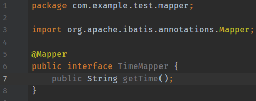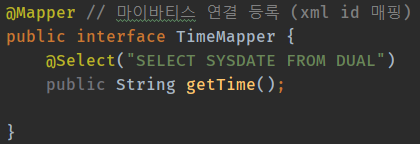 결과물 확인이 제일 쉬운 시간을 뽑기 위해 mapper라는 패키지를 만들고, TimeMapper라는 인터페이스 파일을 아래와 같이 만들어준다.(인터페이스인 이유는 쿼리문 결과가 늘 달라지기 때문에 결과를 받아온 후(주입을 받으면서) 객체구현을 해야하기 때문)