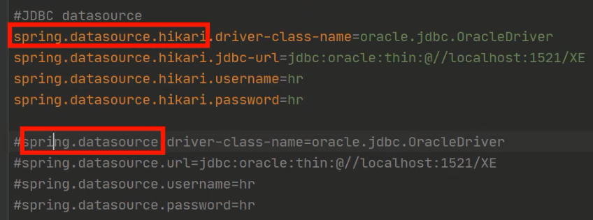 원래는 주석으로 되어있는 경로이지만 우리는 커넥션 풀을 사용할 hikari를 통하기 때문에 경로 설정을 추가적으로 해주어야 한다.